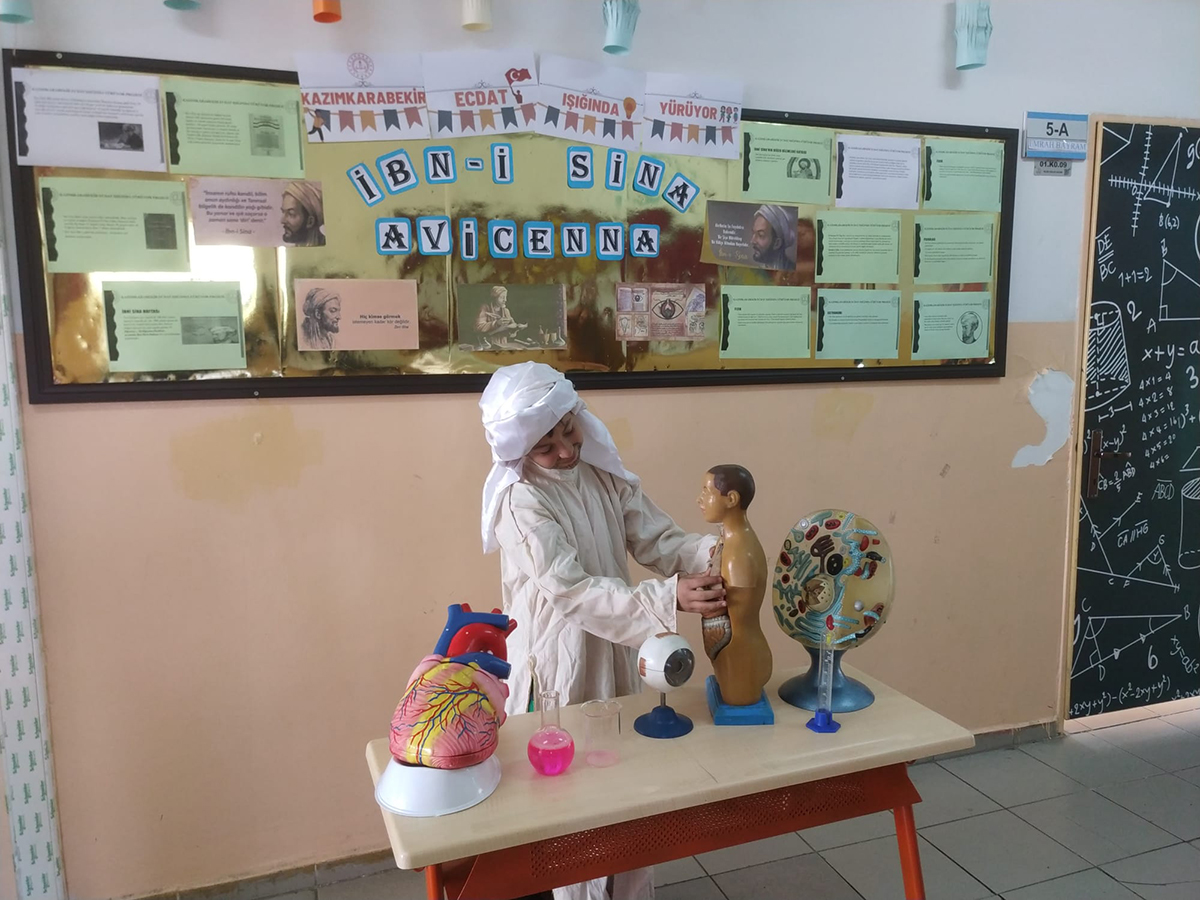Bu kapsamda Kâzımkarabekir Ortaokulu öğrencimiz İbn-i Sina kostümü ile arkadaşlarını bilgilendirdi.