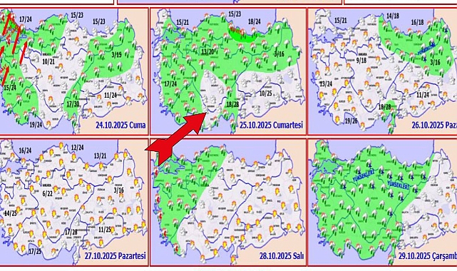 Meteoroloji Genel Müdürlüğü’nün (MGM) 25 Ekim 2025 Cumartesi gününe ait hava durumu tahmin haritası, İç Anadolu Bölgesi’nin büyük bölümünde yağışsız ve bulutlu bir gün yaşanacağını gösteriyor.